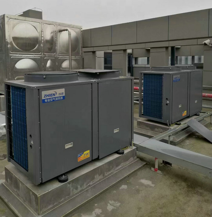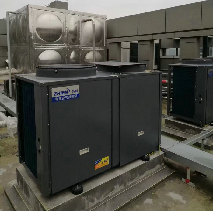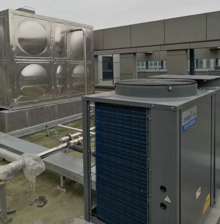 杭州三墩公交停保基地生活用水熱水工程,采用了智恩商用空氣能熱泵熱水機(jī)10匹機(jī)兩臺(tái)+15噸不銹鋼方形水箱(3*2.5*2)