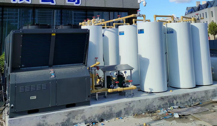 浙江溫州玉環(huán)市方艙醫(yī)院空氣能熱泵熱水工程采用了速熱承壓熱水系統(tǒng)(ZN-KFDX-100Ⅱ+455L)。主要設(shè)備有:4臺(tái)10匹智恩空氣能熱水機(jī)(ZN-KFDX-100Ⅱ)+20個(gè)455L承壓水箱(內(nèi)膽304不銹鋼,外膽201不銹鋼,保溫厚度50MM)