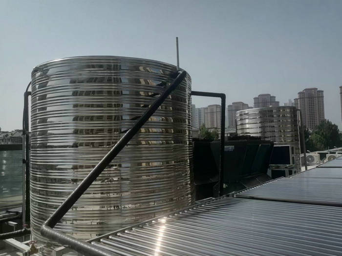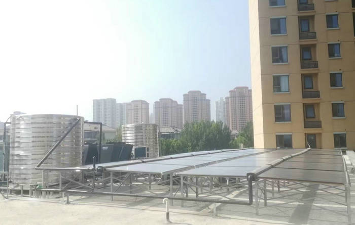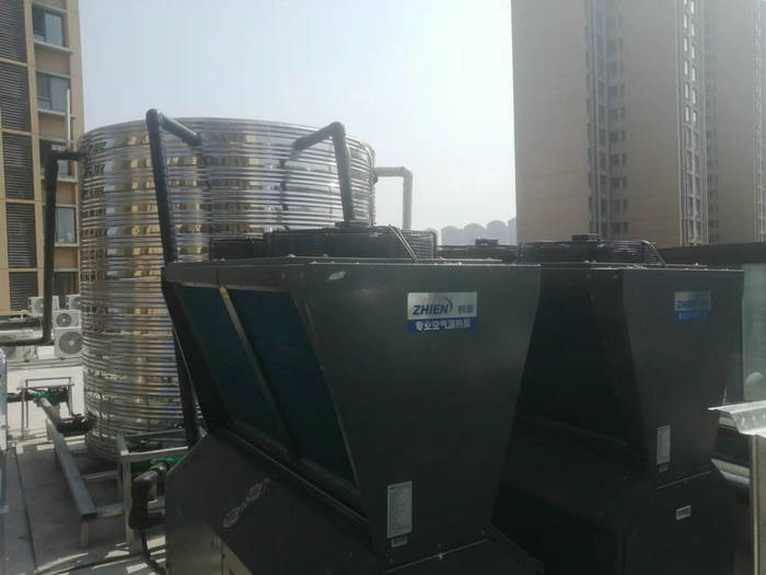 河北一酒店熱水項(xiàng)目采用了太陽能+空氣能熱水系統(tǒng)。16組太陽能集熱器+2臺(tái)15匹智恩空氣能熱水機(jī)(ZN-DKFDX-150ll)+兩個(gè)8噸圓形不銹鋼保溫水箱。